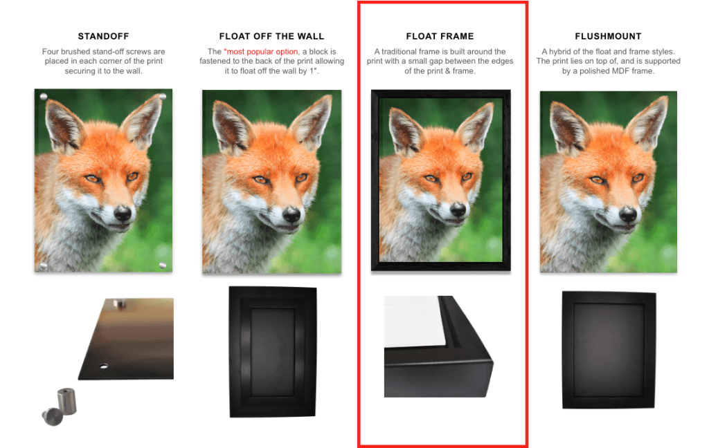 At the heart of our brand is a commitment to creativity, innovation, and quality. We recognize that every customer possesses a distinct vision for their space, be it a home or an office. That’s why we provide an extensive array of customization choices for our acrylic prints, spanning from size and shape to finish and mounting options. Below are our various display and mounting options for our acrylic prints