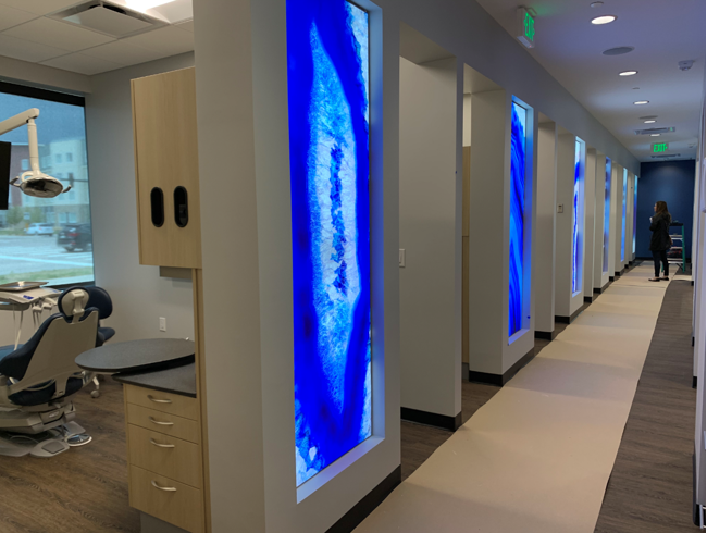 Large illuminated fabric prints can transform an ordinary wall into a dramatic visual centerpiece.