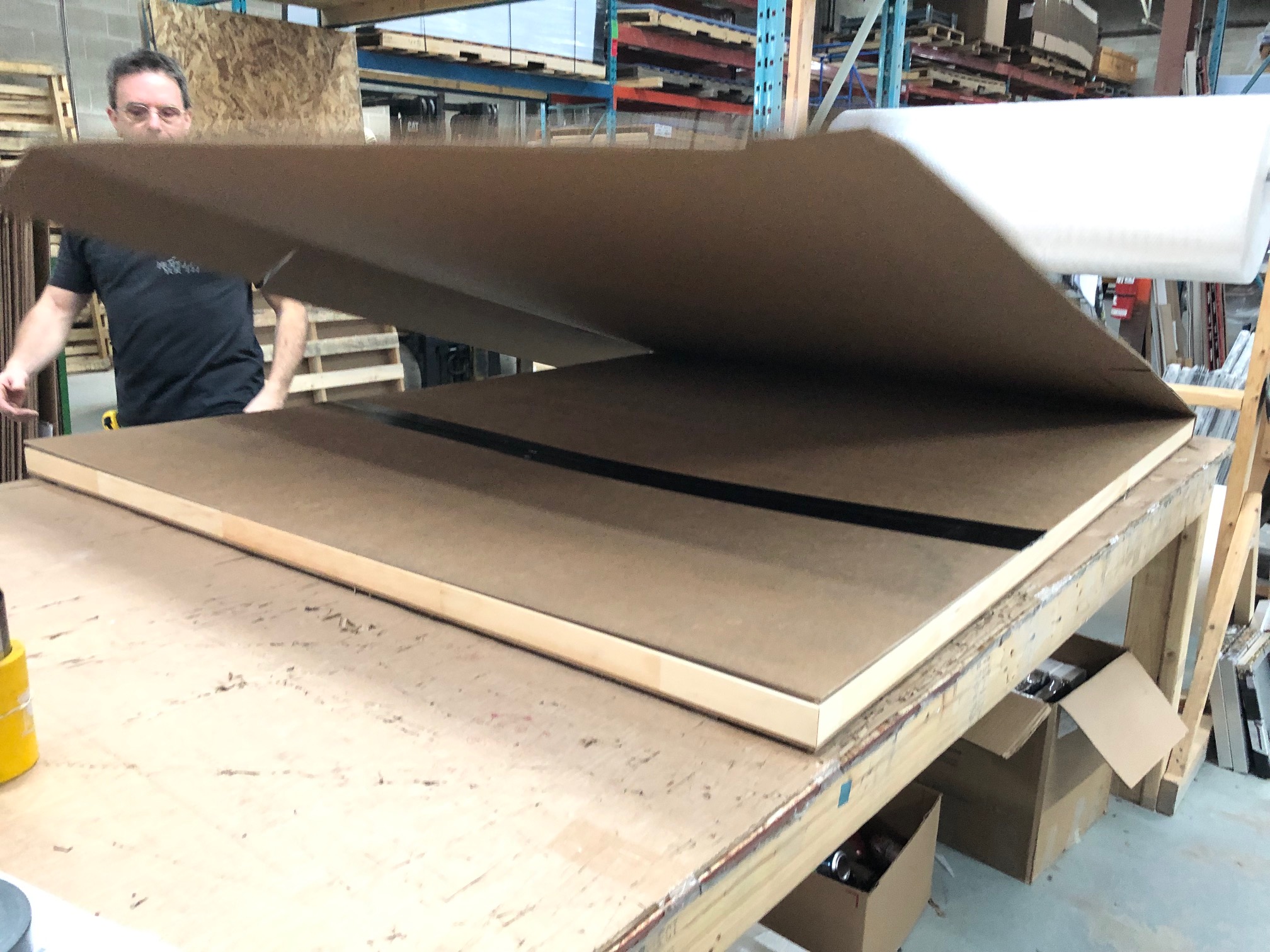 In the recent years, we required a crate to ship anything large than 60 x 4o inches. Our crates are made of wood and very heavy which became problematic and impossible to send via courier. In addition, we could not ship anything larger then 60 x 40 in a corrugated box as the Acrylic and Metal would most likely break. We often needed ship these large panels in a crate and thus be shipped by freight which is considerable more costly than courier. To overcome this challenge, we now include two pieces of MDF board to protect the front and back of the Acrylic and Metal panels. It enables us to be light enough to ship with a courier yet strong enough to endure any careless handling.